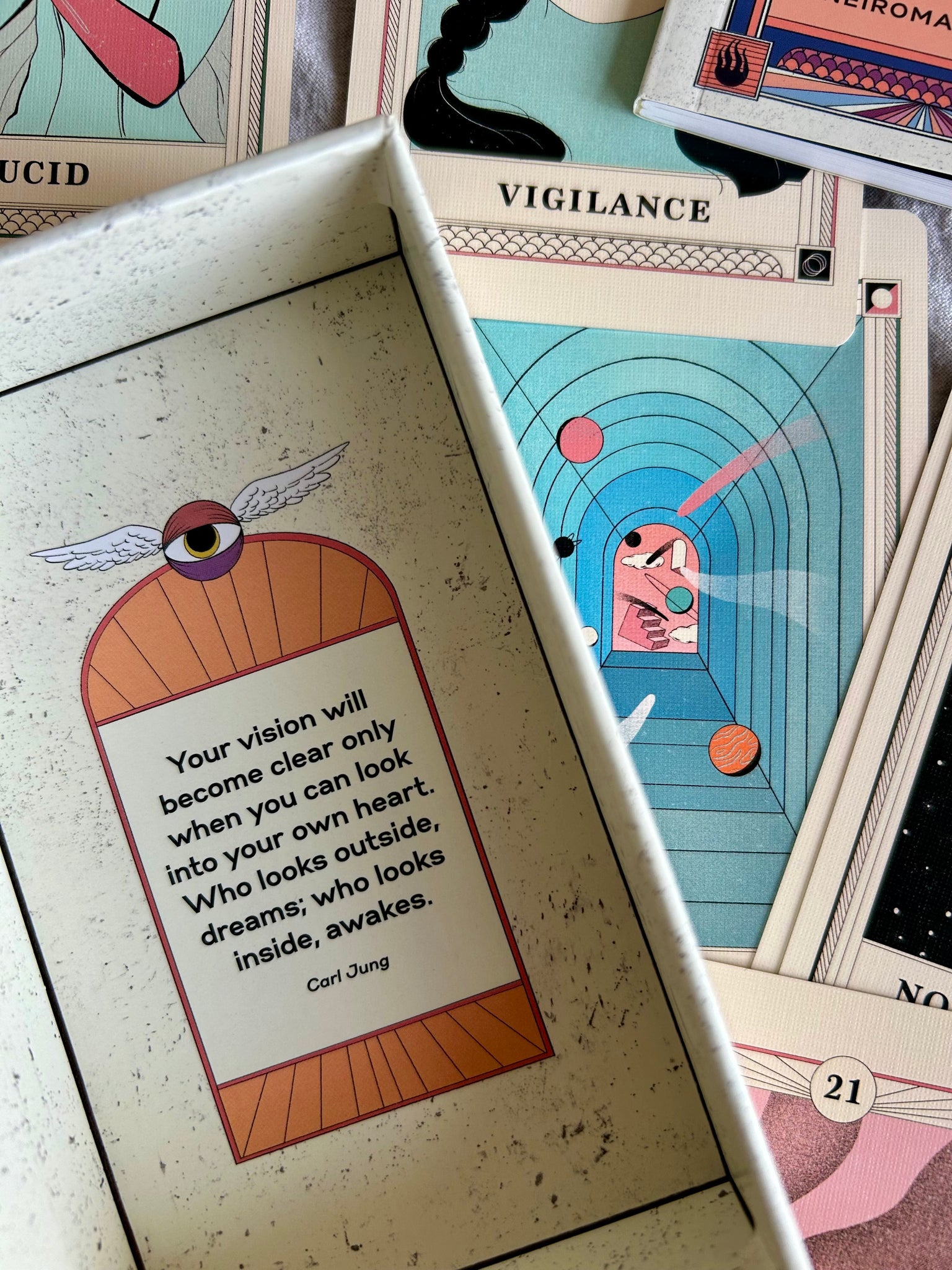 This is the sixth edition of this unique deck that was inspired by Carl Jung and Marie Louise Von Franz to name a few that have contributed to this surreal and ethereal reservoir. Common dream themes like flying, falling, feeling stuck, are all used and described in this deck to help guide and direct us as we meet life's daily and long term challenges. The in-depth guidebook probes deeper into the meaning of these cards for a powerful deep dive.
