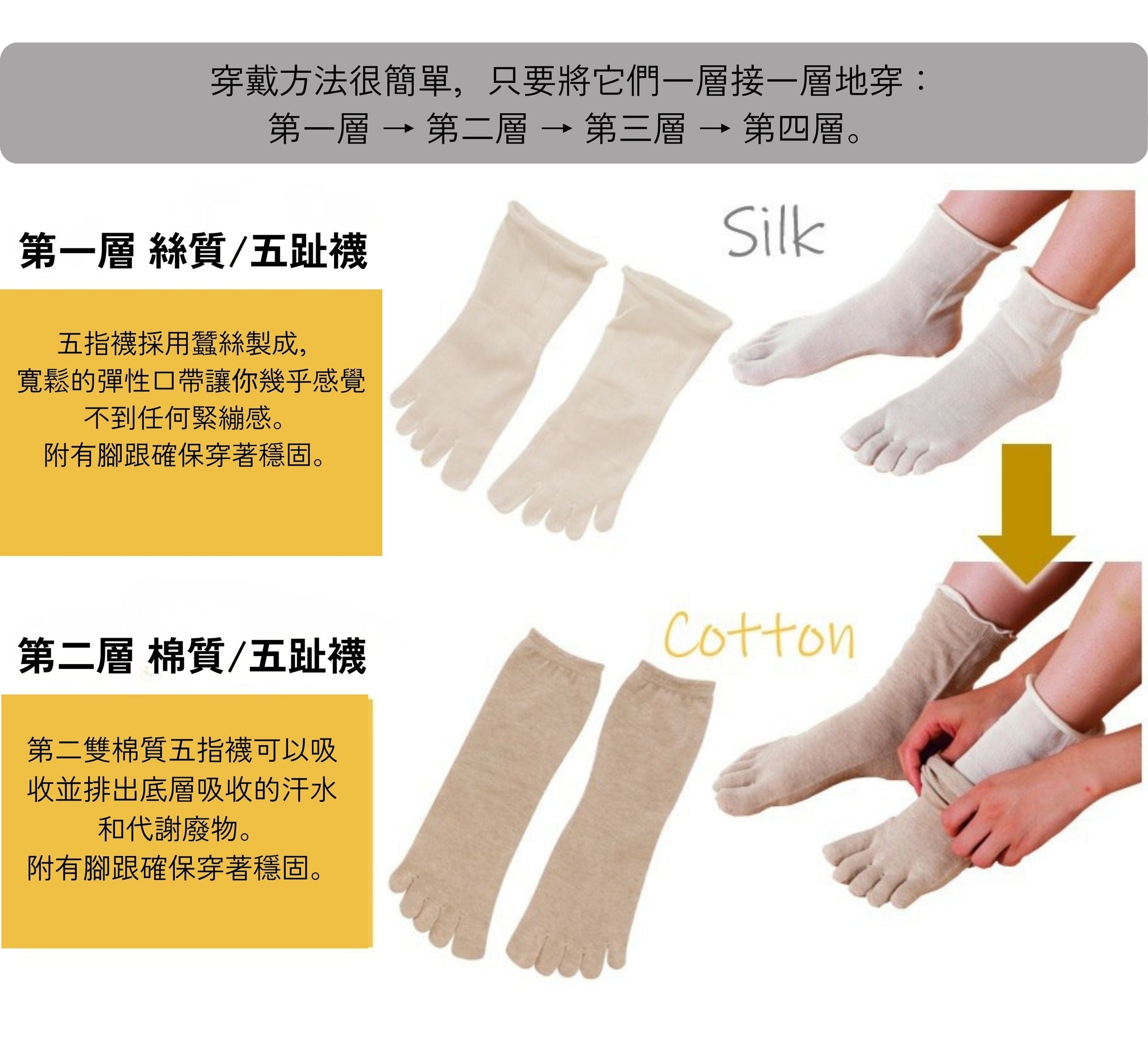 四層襪是任何襪都可以嗎?原則上是,實際上醫師們有比較提倡的形式 --第一層:蠶絲五趾襪 ;第二層:棉質五趾襪;第三層:蠶絲圓頭襪;第四層:棉質圓頭襪。