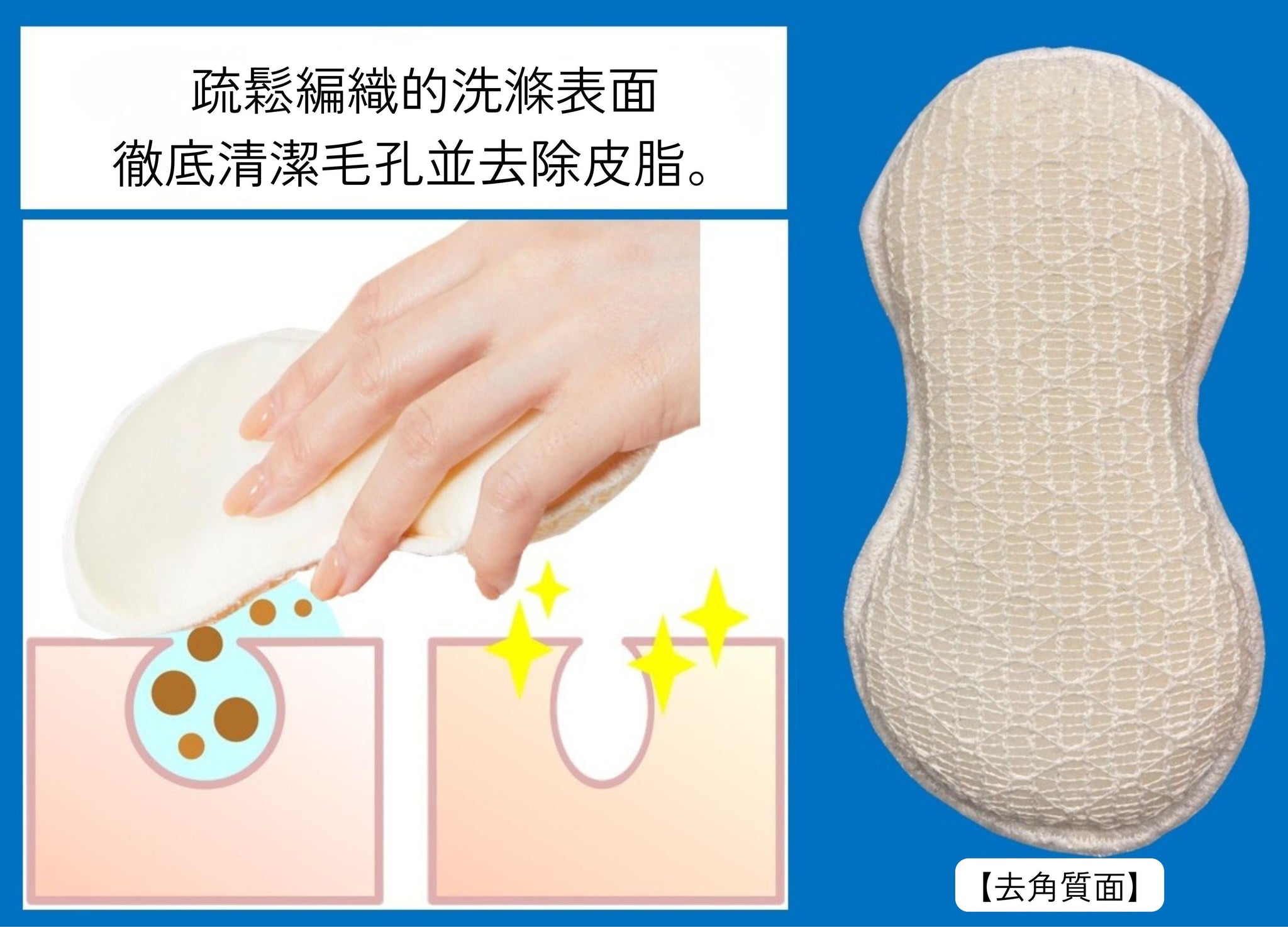 去角質面採用絹紡紬絲(けんぼうつむぎいと),保留天然節疤與樸實紋理,起泡後輕柔按摩即可深層去角質、清除毛孔髒汙,不傷肌膚。