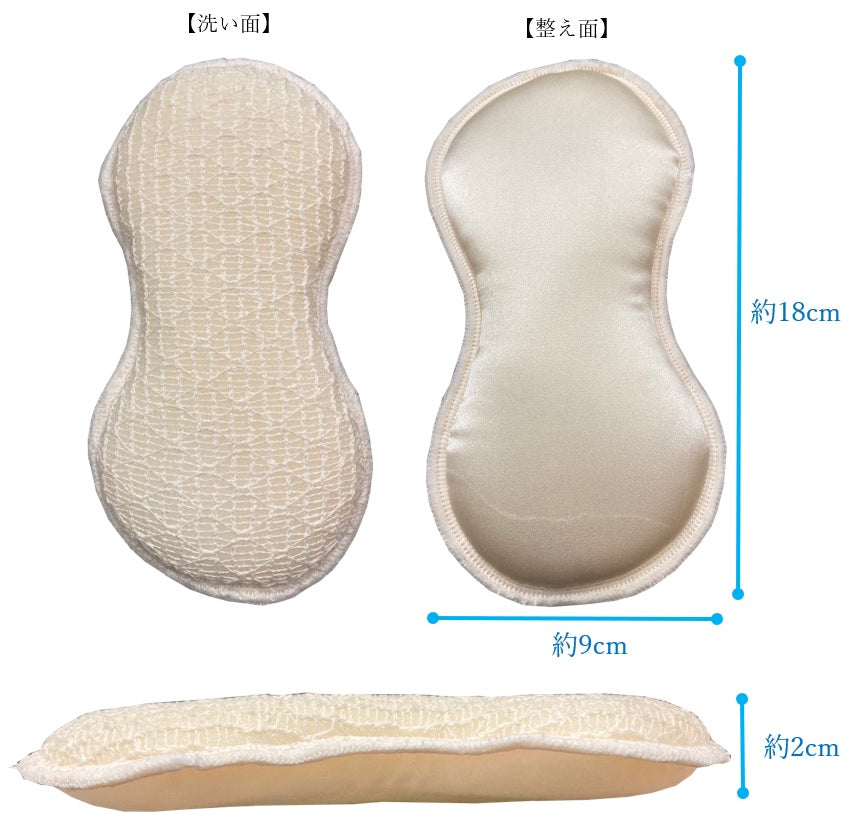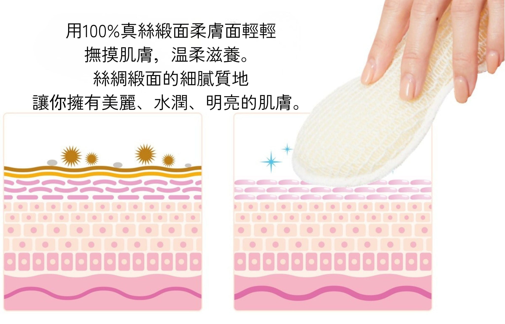 柔膚面選用細膩緞面絲(サテン糸),觸感如奶油般滑順,洗去泡沫後輕撫肌膚,瞬間帶來水潤通透觸感,長期使用有預防新色素沉澱。