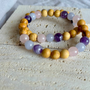 這條手串以天然聖木為基底,串連三種高頻率水晶:粉晶、紫水晶與海藍寶,散發出淡淡的天然聖木油香。無論靜心、冥想或日常配戴,都是陪伴你能量穩定、回歸內在中心的守護飾品。
