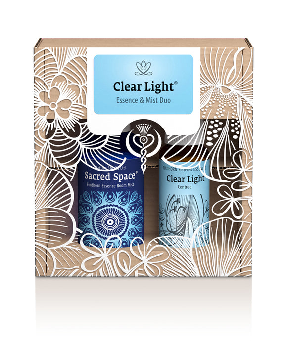 Clear Light Essence & Mist Duo contains 1 x 50ml Sacred Space Room Mist and 1 x 30ml Clear Light Combination Essence Drop Bottle