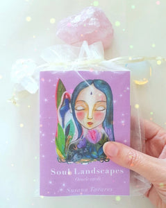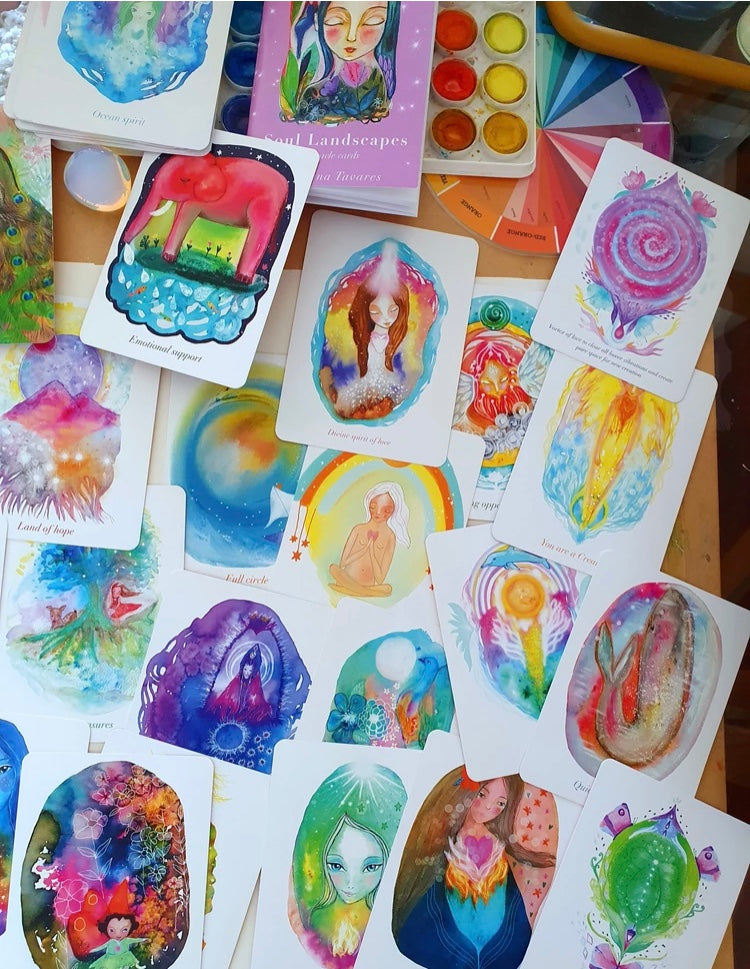 The Soul Landscapes oracle deck is a 44 card deck and guide book with channeled illustrations and messages. This is Susana Tavares's fist original deck, all images and messages were created by Susana Tavares.