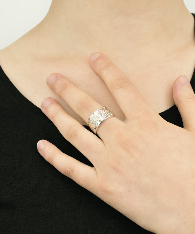 We use the Sri Yantra in a fine and delicate design ring. Even the wires in the ring contain the Golden Ratio (Phi) ratio in relation to each other.