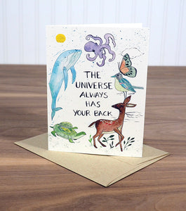 "The Universe Has Your Back" is a print of an original watercolor artwork depicting animals in a sweet surround of some reassurance. Give comforting words to a friend, coworker, family or loved one.