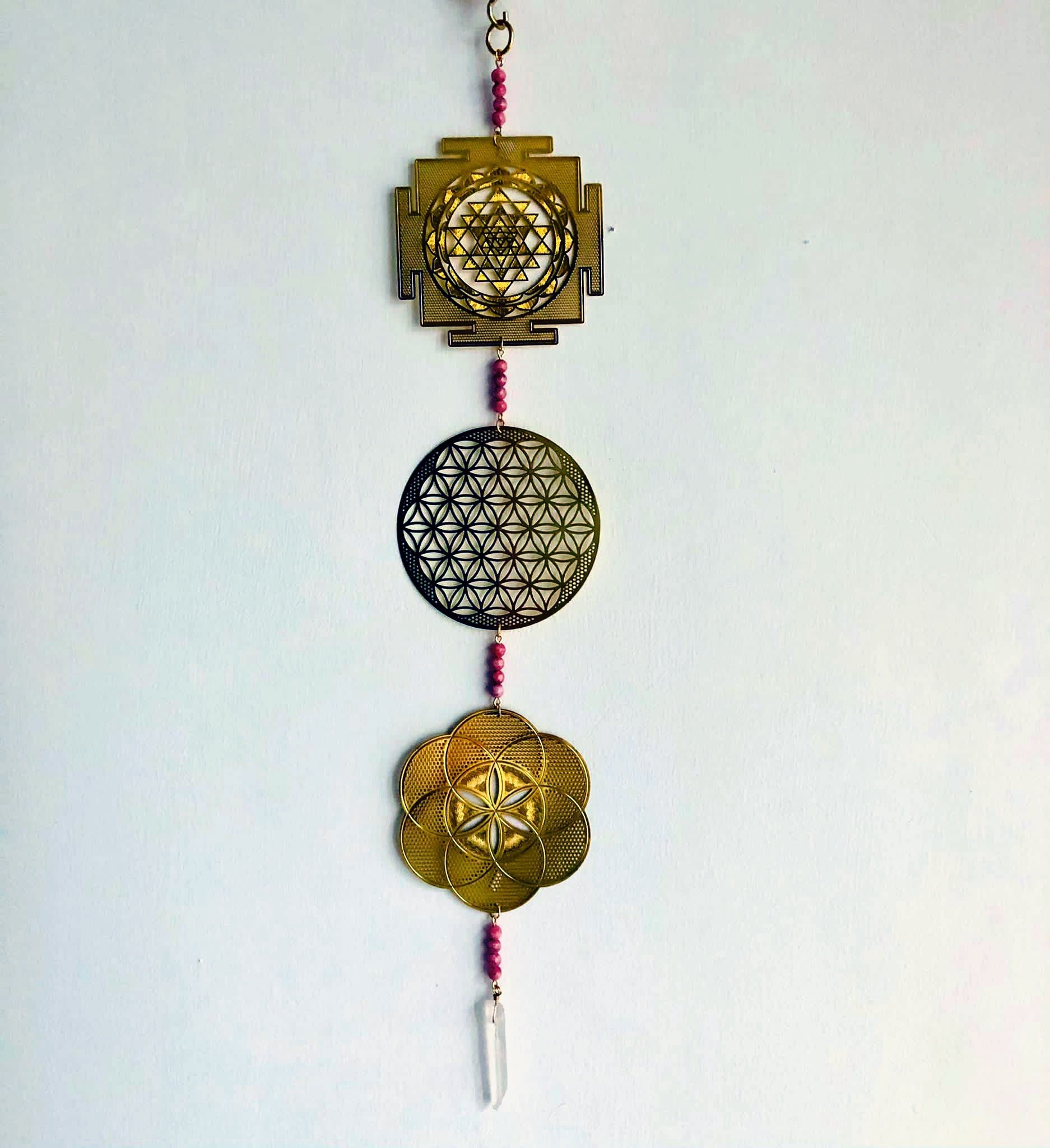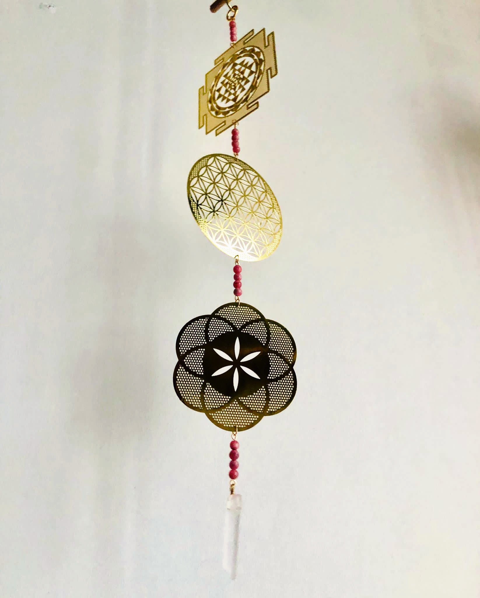 Sri Yantra - translates to ' holy instrument', a tool for obtaining worldly desires through manifestation; balances the masculine and the feminine; brings harmony to opposites; stimulates the third eye